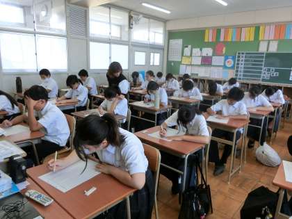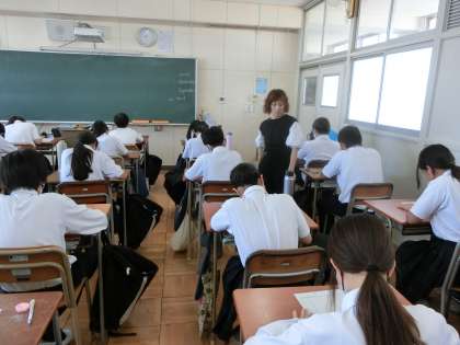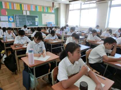 1年生英語の授業で「単語テスト」が行われています。夏休みの宿題で取り組んだ英単語50個を答えていきます。皆さん頭をひねりながら次々に英単語を書き続けます。夏休みの学習の成果がわかるテスト。皆さんどのくらい解けそうですか。