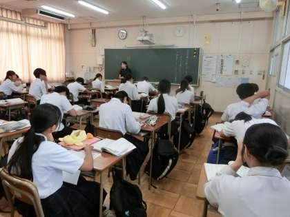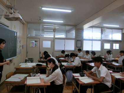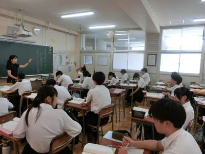 3年生国語の授業で「万葉集」の和歌を鑑賞しています。先生が防人(さきもり)の詠んだ和歌を解説されています。防人は故郷を離れて北九州へと赴き、防衛にあたった兵士のこと。旅立つわが子を心配する父母への思いや愛情など、防人のせつない気持ちが詠まれています。