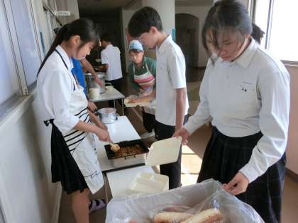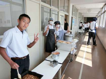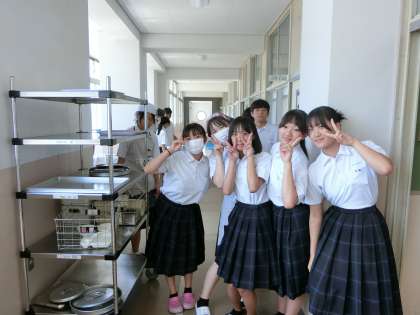 午前の授業が終わり、3年生の皆さんが給食の準備を始めました。今日は「カレーマカロニグラタン・豚と野菜のスープ・ミカン」の洋風メニュー。鶏肉と玉ねぎ・マッシュルームがたっぷり入ったマカロニグラタンは香ばしいカレーの風味が美味しそう。パンと一緒にいただきましょう。