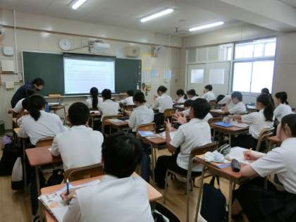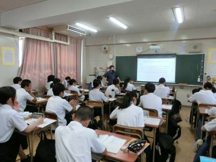 2年生英語の授業で「動名詞」の使い方を教わります。「動詞+ing」で「〜すること」という意味になります。動詞に「 ing 」を付けることで、名詞のような使い方ができるそうです。「 Running is fun.(走ることは楽しい)」のように、主語として使うこともできますね。