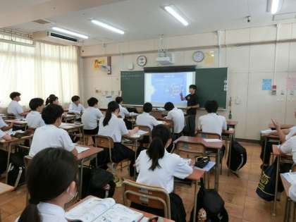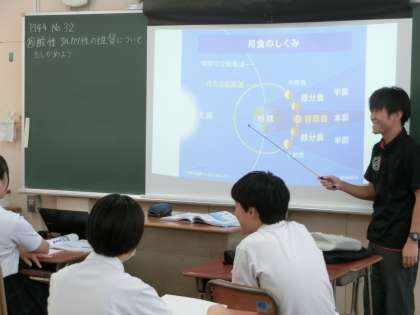 3年生理科の授業で、先生が「月食が起こる仕組み」を説明しています。本日9月8日の未明(午前2時頃)に日本各地で皆既月食が見られました。早速、授業を使って「月食」についてのレクチャーが。観察しにくい時間帯だったのですが、美しい天体ショーを見た人はいるでしょうか?