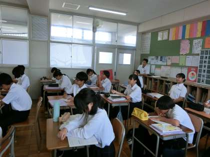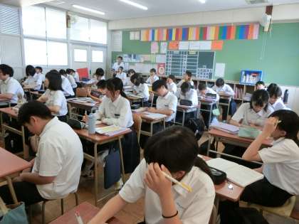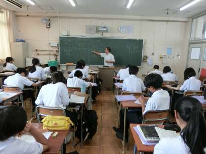 1年生数学の授業で「一次方程式」の計算問題を解いています。「2(x+5)=16」など、カッコのついた問題を、先生が「分配法則」を使って解き方を解説されています。中学の数学ではとても大切な計算(解き方)だそうです。皆さん、数多く問題を解きながら、使い方をおさえましょう。