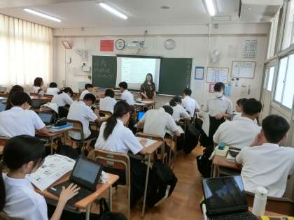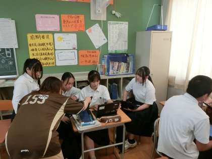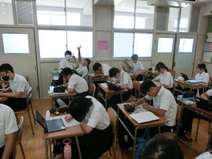 3年生美術科の夏休みの宿題「学生服のデザインを考えよう」。それぞれが考えた制服について、パソコンでデータを作成し、プレゼンテーションを行うことになりました。皆さんタブレット端末を使ってさっそく資料作成を始めました。さて、どんなプレゼン資料が出来上がるでしょうね。