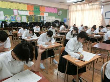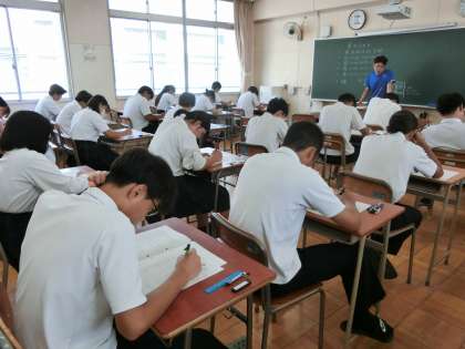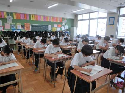3年実力テストが始まりました。1時間目は「理科」のテスト。皆さん集中して解答用紙にペンをすべらせています。授業で習った内容が出題されているようです。しっかりと思い出しながら、1問1問着実に解き進めましょう。