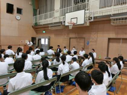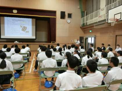2年生で取り組んでいる「次世代の職業体験プログラム」。「あなたの大切な人をしあわせにするパンを考えよう!」をテーマに、(株)ダイヤさんの協力の下、各クラスでパンのアイデアを考えました。今日は皆さんからの商品開発シートをもとに、ダイヤさんがクラス代表の作品を作って来てくださいました。各クラスの作品が披露されます。皆さんワクワクしますね。