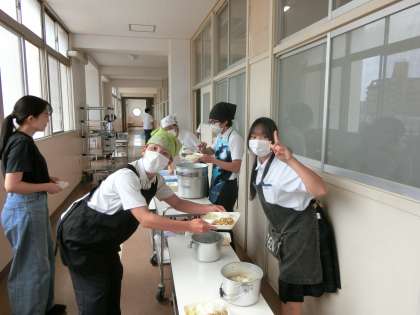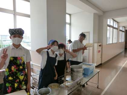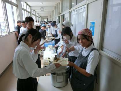 お昼休みのチャイムが鳴り、3年生の教室前で給食の配食が行われています。今日のメニューは「他人丼・ササミとキャベツの炒め物・オクラの甘酢和え・芋けんぴフィッシュ」。牛肉と玉ねぎ・人参を和風出汁でじっくり煮込んだ他人丼。おつゆをたっぷりかけていただいてくださいね。