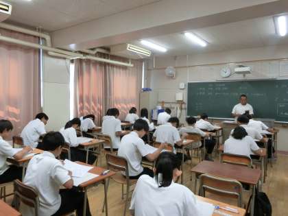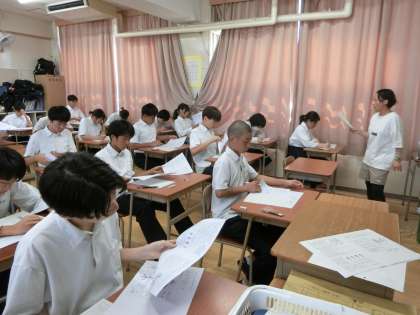 現在、2時間目のテストが行われています。2年生の教室では「理科」のテストを実施中。先日、顕微鏡を使って植物の細胞の仕組みを観察しましたが、顕微鏡の操作の仕方など、関連する問題が出ているようです。授業で習った内容をよく思い出してくださいね。
