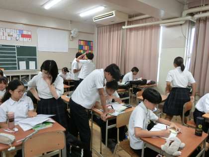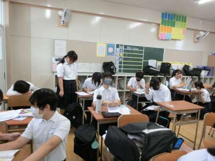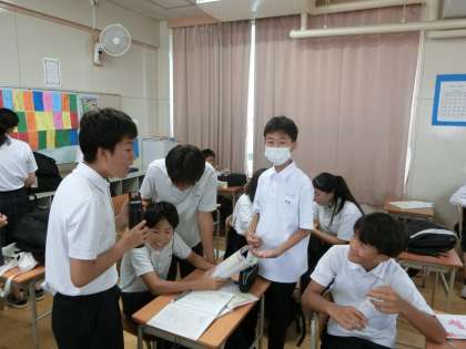2年生の教室でも、1時間目のテスト(数学)にむけて最後の追い込み中。これまで繰り返し解いてきた計算やグラフの問題がきっと出るハズと、皆さんが予想しています。予想が的中してくれると良いですね。