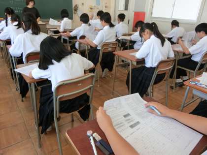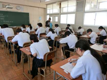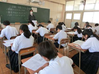 2日間行われた中間テストも最後の教科になりました。現在、1年生の皆さんが社会科のテストを受けています。写真や図表などの資料を見て回答する問題もあるようです。社会科では各種資料を読みとる力がとても大切。資料のどの部分に着目するか、ポイントをマスターしましょう。