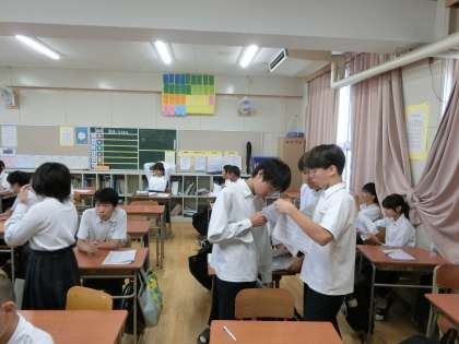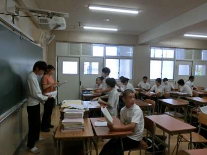 2年生の教室で「国語科」のテストが返却されています。解答用紙を受け取ったら、早速クラスメイトと解答用紙の見せあいっこが始まります。良かったところや悔しかったことを、互いにやりとりしている模様。いつの時代もテスト返しでよく見られる光景です。