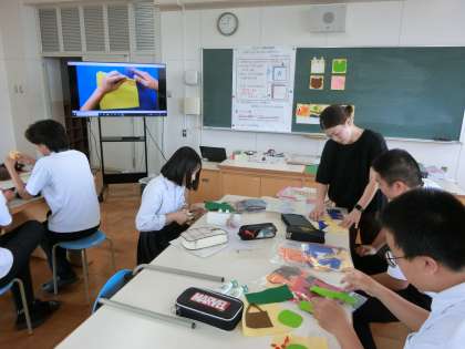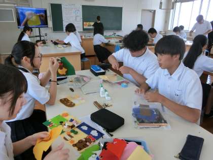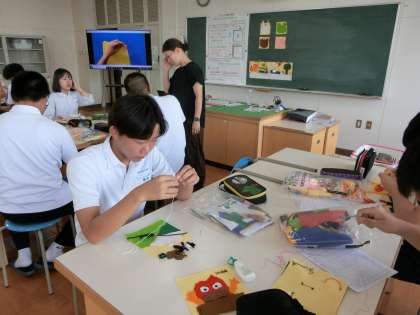 3年生家庭科の授業で製作している「フエルト生地で作る幼児向け絵本」。皆さん作品の完成をめざして、細かなパーツの縫製作業に入りました。被服室のディスプレイには「縫い方」の映像が繰り返し流れています。縫い方についてわからない点があれば、映像を参考にしてくださいね。