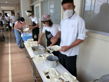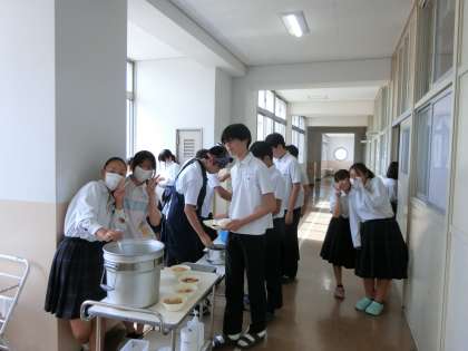 午前の授業が終わり、3年生の皆さんが協力して給食の準備中。今日は「サゴシのおろし醤油・根菜の含め煮・牛ひじきそぼろ」の和風献立。サゴシは瀬戸内でよく獲れるおさかなで、成長すると「サワラ」と呼ばれます。白身魚の淡白なお味を楽しんでくださいね。