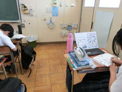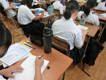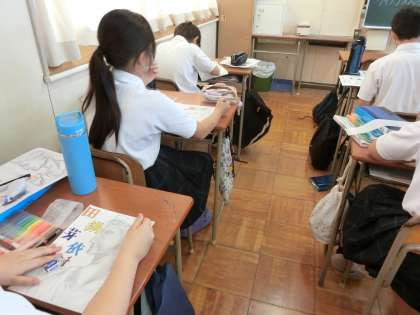 1年生美術科で、ファイルの表紙に使う絵を制作中。3年間授業で使う「美術ファイル」の表紙をみんなで考えています。パソコンで参考になる資料を検索したり、授業で教わったレタリングを取り入れたり、皆さんアイディアを凝らしてステキな表紙を創作しています。