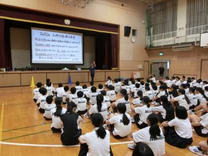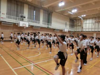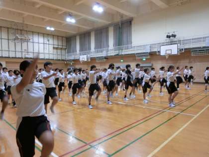 体育大会にむけた学年練習がスタートしました。体育館では1年生の皆さんが集まり「入場行進」の採点基準について説明を聞いています。クラス対抗で行進の美しさ・力強さを競いあう恒例の取り組みです。さっそく練習が始まり、皆さん元気よく行進していますね。