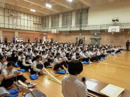 体育館に全校生徒が集まってきました。これから「後期生徒会役員立候補者」の立会演説会が始まります。立候補者と応援演説者が壇上にずらりと並びます。桃中のために頑張る皆さんの気持ちや想いをみんなで受けとめ、一緒に生徒会活動を盛り上げてくださいね。