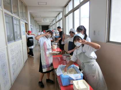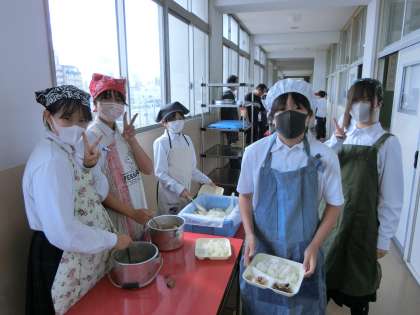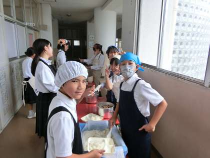1年生の皆さんも協力して給食の配膳中。とうがん(冬瓜)が入ったお味噌汁は柔らかく煮込まれた冬瓜に味がしっかりしみ込んでいますよ。名前は冬瓜ですが、夏野菜の一つだそうです。皆さん、美味しくいただきましょう。