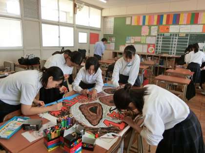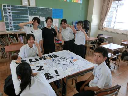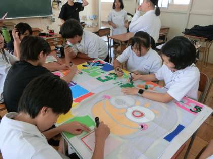 放課後の1年生の教室では体育大会の「クラス応援旗」を制作中。クラスメイトが集まって、ワイワイとにぎやかに応援旗を作っています。各クラスで考えたデザインがユニークかつステキです。担任の先生を思わせるイラストが入ったものなど、クラスのカラーが出ていますね。