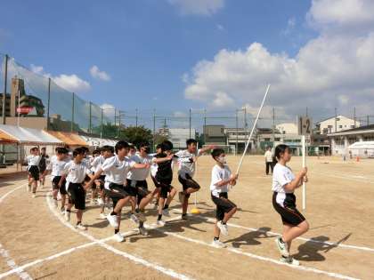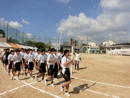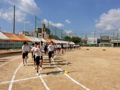 1年生の皆さんが運動場で「入場行進」の練習中。今日は当日と同じ距離を行進します。皆さん大きく腕を振り、元気よく行進します。全体の入場行進が完了するまで結構時間がかかるので、最初から飛ばしすぎないようスタミナの配分を考えましょう。