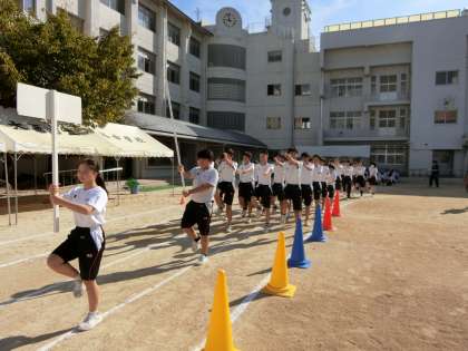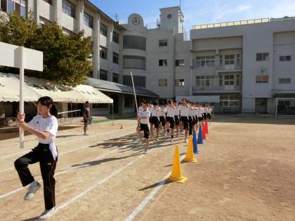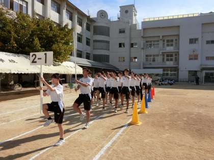 運動場では2年生が体育大会の学年練習を行っています。まずは入場行進の練習から。クラスのプラカードを先頭に、皆さんが入場してきました。腕の振りや足の上げ方が揃っていると、とても美しく見えますね。本番まであと1週間あまり。気持ちを合わせて、美しさと力強さを磨いてくださいね。