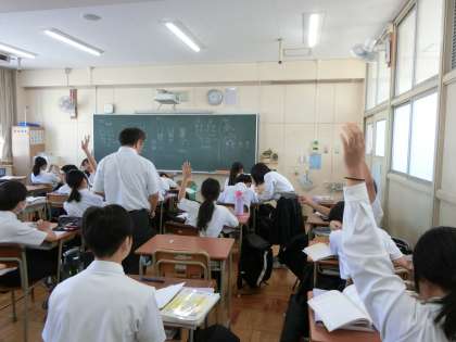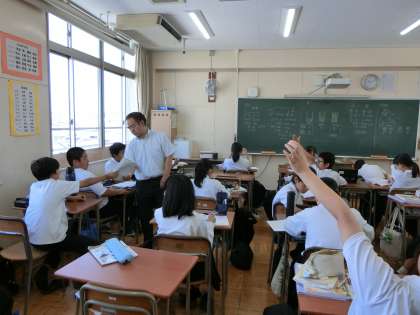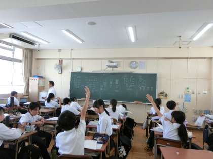 1年生数学の授業で「比例式」の問題を解いています。「ケチャップとソースを2:3の割合で混ぜてハンバーグソースを作ります。ケチャップを120ml使うとすると、ソースは何ml必要でしょう?」教室では、解けた人から順に手が挙がります。みんなでワイワイ競い合っていますね。