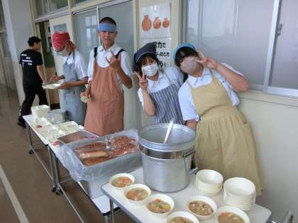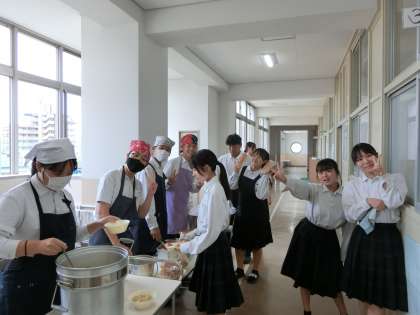 午前の授業が終わり、3年生の皆さんが協力して給食の準備中。今日は「鶏とサツマイモのシチュー・白菜のピクルス・リンゴ」の洋風献立。白ワインで下味をつけた鶏肉に、サツマイモやニンジン・玉ねぎがたっぷり入ったシチューは具材の甘さが溶けだしています。皆さん、よければお替りしてくださいね。