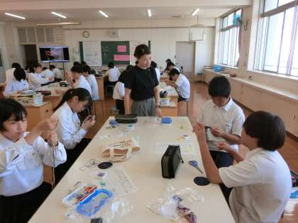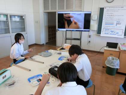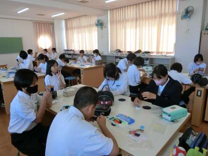 1年生家庭科の授業で「ピンクッション(針山・針刺し)」の製作が始まりました。生地を縫い合わせて、中に綿をつめて作っていきます。被服室の前には縫い方のお手本動画がくり返し流れています。わからない点があれば、先生に教わったり、動画を確かめたりしてくださいね。