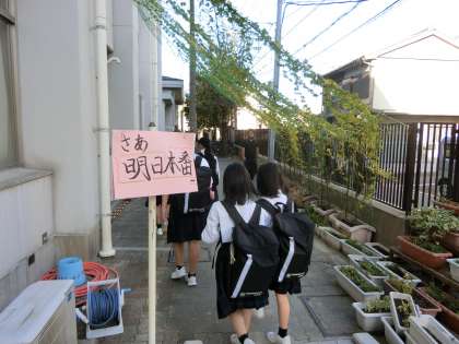 爽やかな秋空が広がる朝。今日も皆さん元気に登校してきました。明日(10月10日(金))は体育大会。進行の都合上、明日は給食がありません。生徒の皆さんは昼食(お弁当)の用意を忘れないように、気をつけてくださいね。