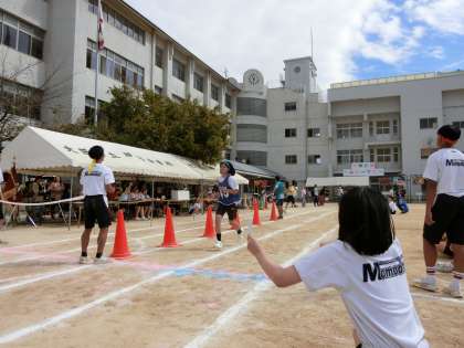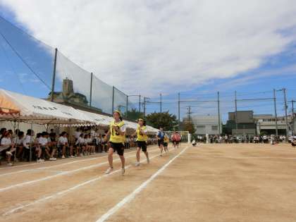 競技は長距離走に入りました。まずは女子「800m走」を行います。トラック5周と3分の1を走ります。各クラスから選ばれた健脚が互いに競い合います。ペース配分を考えて、トラックを駆け抜けましょう。