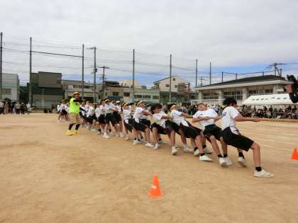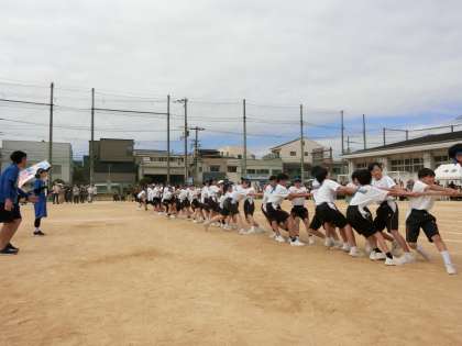 体育大会午前の部の最後は各学年で「綱引き」を行います。まずは1年生から。3クラスの総当たり戦で勝敗を決します。担任の先生がクラスの列の横に陣取り、みんなにエールを送ります。1年生の皆さんの掛け声がとても可愛いですね。