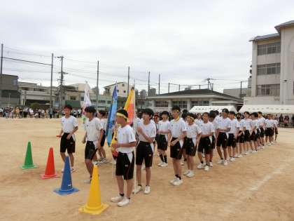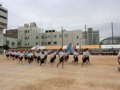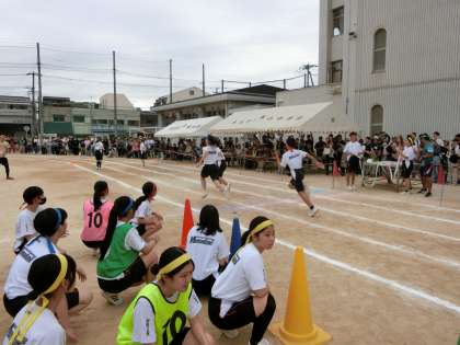 学年全員が参加する「全員リレー」。1年生に続いて2年生がスタート地点にやってきました。各クラスの仲間がバトンをつなぎ、トラック約17周を駆け抜けます。男女の順番をどうするか、組み合わせもタイムに影響するかも。クラス毎に秘密の作戦があるんでしょうね。