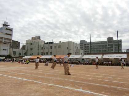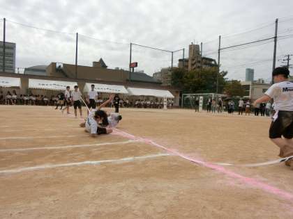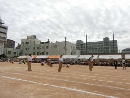 プログラム9番は「ジャンプ×3。足から腰まで麻袋にすっぽり入り、飛び跳ねながらゴールをめざします。ジャンプするリズムが合わないと、なかなか前に進みません。バランスをくずして転んでしまう選手も出ているようです。ケガしないように気をつけてくださいね。