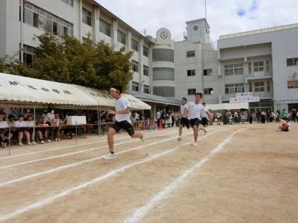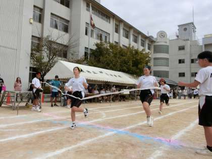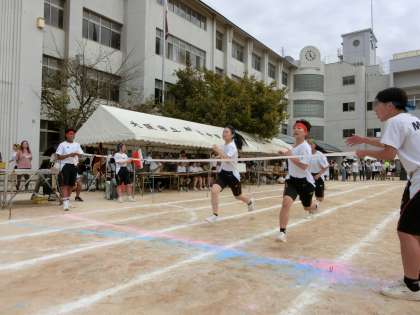 個人競技の最後は「1周走」。トラックを1周駆け抜けます。トラック1周は約150mあります。各コーナーをいかに減速せずに走ることができるかが、勝敗を左右します。皆さん、頑張ってくださいね。