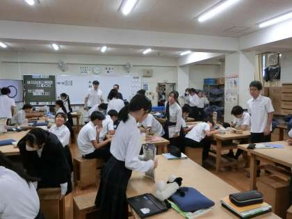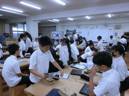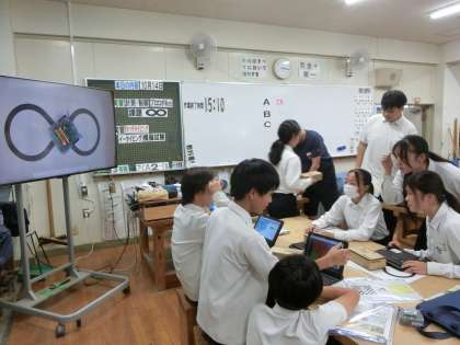 2年生技術科で製作してきたプログラミング・ロボット。クルマのように4つの車輪があり、プログラム通りに自走するとのこと。プログラムによっては、8の字になった(黒い)道をセンサーが感じ取りクルクルと走るそうです。皆さん、上手くいきましたか?