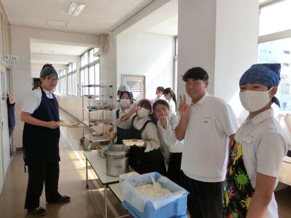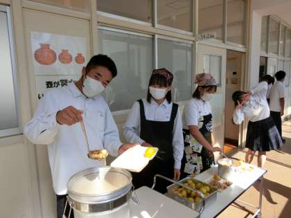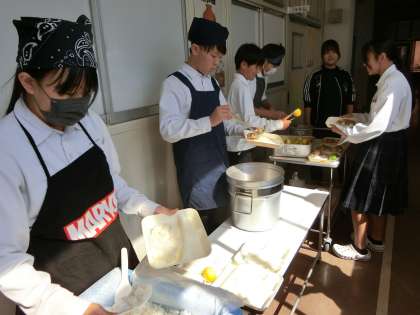 お昼休みのチャイムが鳴り、3年生の教室前で給食の準備が始まりました。今日のメニューは「中華丼・厚揚げの中華だれがけ・みかん」です。中華丼は、豚肉とお野菜、うずら卵を中華スープで味付けしました。皆さんしっかり食べて午後のテストを乗り切りましょう。