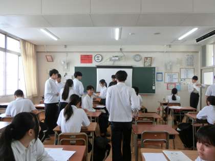 先週金曜日に実施された3年生第3回実力テスト。週が明け、さっそく数学のテストが返ってきました。先生から1人ずつ解答用紙が手渡されます。得点に一喜一憂する姿は昔も今も変わらない光景です。「次こそは!」の決意を新たに、皆さん頑張りましょう。