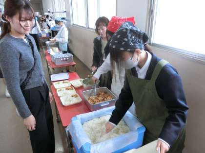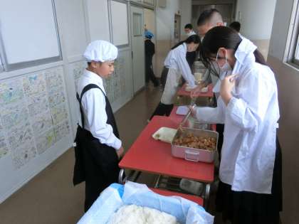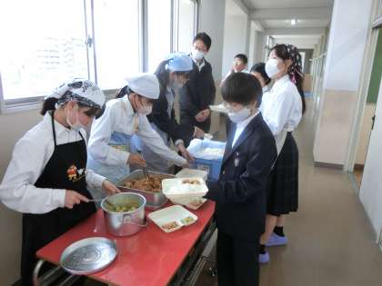 お昼休みのチャイムが鳴り、1年生の皆さんが給食の準備を行っています。今日は「とり天・どさんこ汁・抹茶団子」の和風メニュー。カラッと揚がった鶏の天ぷらは食感を楽しんで。豚肉と根菜がたっぷり入ったどさんこ汁はお味噌汁風に仕上がっています。今日のメニューは「学校給食献立コンクール」で優秀賞を受賞したそうですよ。