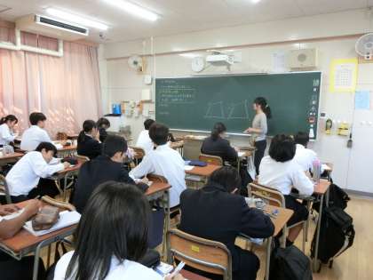 2年生数学の授業で「図形」の学習が始まりました。今日は「図形の合同」について教わります。2つの図形の形が全く同じ場合、数学では「合同」といい、辺の長さや角度が全部同じになります。図形の証明問題などで出てくるので、覚えておきましょう。