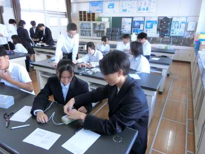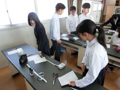 3年生の皆さんが理科室に集まり実験を行っています。今日は記録タイマーを使って歩く速さを調べます。記録タイマーにテープを通し、そのテープを持って数m歩くと、タイマーが歩く速さを記録するとのこと。皆さん、上手く測定できましたか?