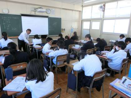 1年生数学の授業で「比例のグラフ」の書き方を教わります。「 y= ax 」の式をグラフにすると、原点(0,0)を通る直線のグラフになるそうです。スクリーンに映されるグラフを参考に、実際に比例のグラフを書いてみましょう。