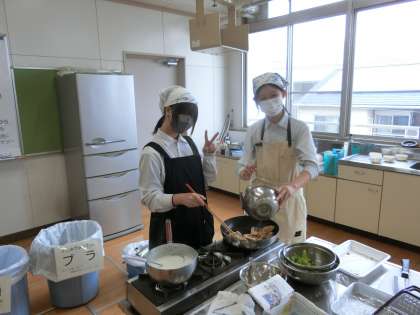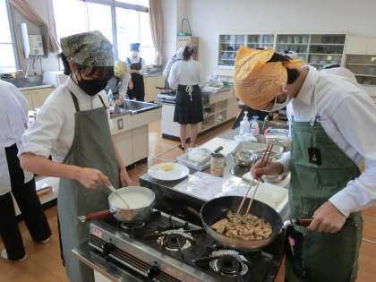 2年生の皆さんが家庭科の調理実習に取り組んでいます。「豚の生姜焼・コーンスープ・ブロッコリーのごま和え」が今回のメニュー。各班ごとに役割を決めて、それぞれ調理に取り掛かります。あちこちのテーブルから生姜焼の良い香りがしてきました!互いに協力して美味しい料理を作ってくださいね。