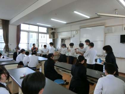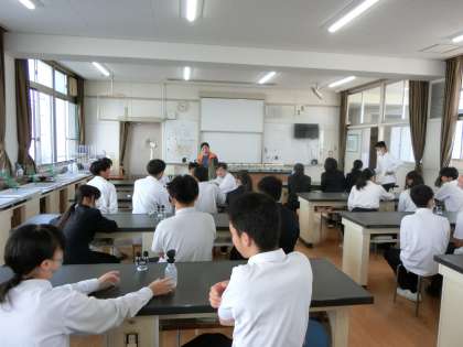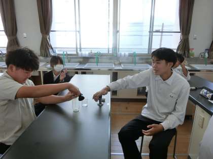 2年生の皆さんが理科室に集まり「雲の発生」の実験を行います。少量の水が入ったボトルに線香の煙を入れて圧力を加えます。急に圧力を抜くと、ボトル内の空気が膨らんで温度が下がり、雲が発生するそうです。皆さん、雲の発生を見ることができましたか?
