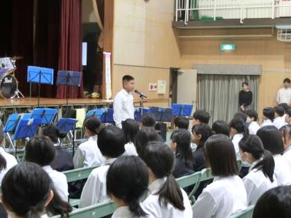 桃谷中学校「第7回文化発表会 舞台発表の部」が始まりました。まずは生徒会会長さんの開会あいさつから。今日の発表にむけて取り組んできた成果を存分に発揮し、楽しく思い出に残る発表会になると良いですね。