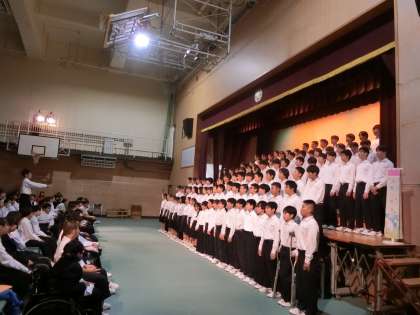 2年生の皆さんが舞台に登場しました。「8期生 "魂"の全体合唱」をテーマに2曲を合唱します。今年は「友情・団結」を意識して練習に励みました。2年生全員が心を1つにして美しいハーモニーを会場全体に響かせています。