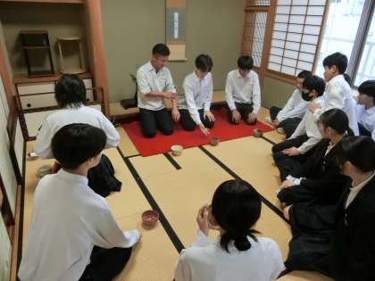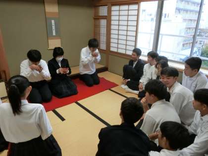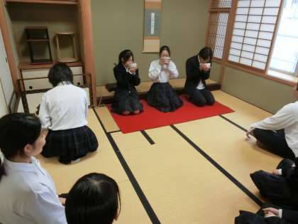 和室では茶道部の皆さんがお点前を披露しています。茶道の世界を知るよい機会です。各クラスとも3名に限り、部員の皆さんが点てたお茶をいただけるとのこと。皆さん、お味はいかがですか?