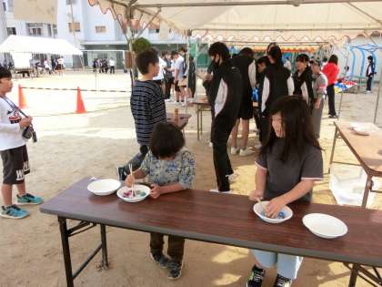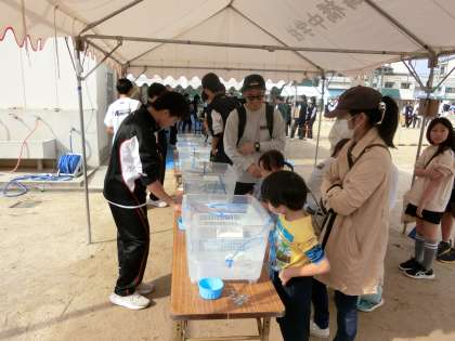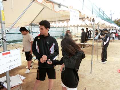 2年生の皆さんもゲームブースを開いています。それぞれのクラスが「コイン落とし」「ストップウォッチ10秒チャレンジ」「ビー玉つかみ」で小さい子たちをおもてなし。皆さんニッコリ笑顔で良い雰囲気です。