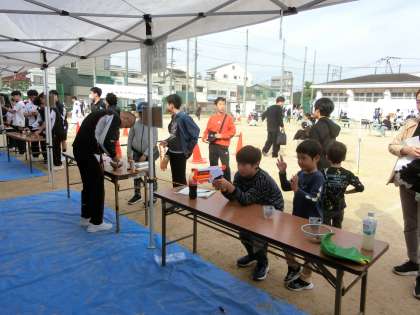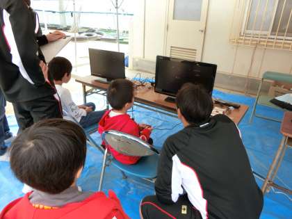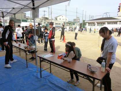3年生のブースにテレビが数台セットされています。どうやらテレビゲームが楽しめるようです。今日は、昔懐かしい「パックマン」で遊びます。射的のブースは子どもたちで大にぎわい。上手く命中できるでしょうか?