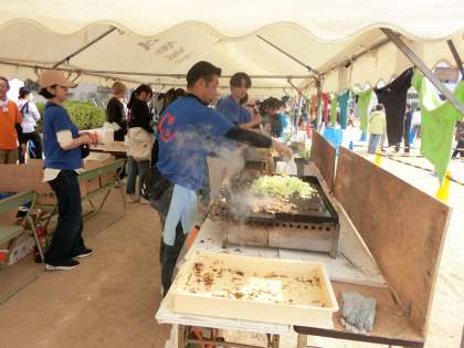 勝山地域の青少年指導員さんが「焼きそば」を焼いてくださっています。大きな鉄板で作る焼きそばは、香ばしいソースの良い香りが広がります。桃中祭恒例の焼きそばをぜひご賞味ください!