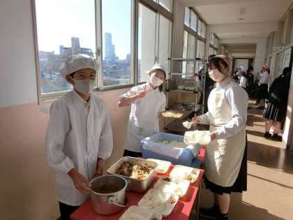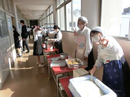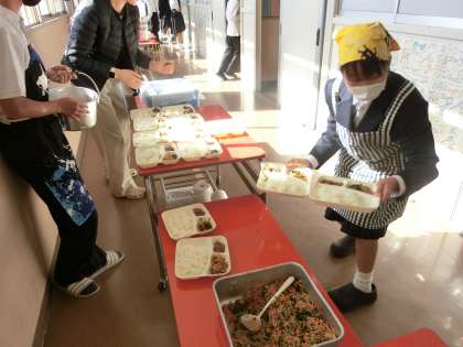午前の授業が終わり、1年生の皆さんが協力して給食の配食中。今日のメニューは「ピビンバ・わかめスープ・ミニフィッシュ」。ピビンバは韓国の混ぜごはん。コチジャンで味付けしたひき肉とホウレンソウやモヤシ、ニンジンなどのお野菜をごはんに混ぜていただきます。ごま油の風味が良いですね。皆さんたくさんいただいてくださいね。