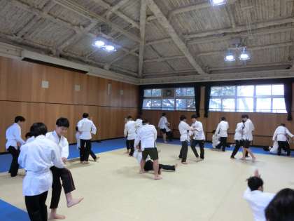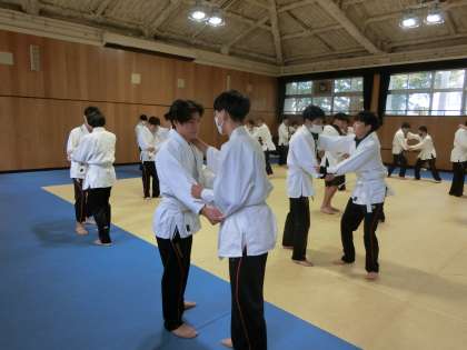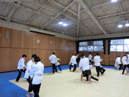 3年生男子の皆さんが武道場で柔道の稽古に励んでいます。技をかける方を「取り」、技を受ける方を「受け」と呼び、2人1組になって技の精度を高めます。現在は「膝車(ひざぐるま)」の技をかけあいます。足を支点に体を大きく回転させて相手を投げるダイナミックな技ですね。、