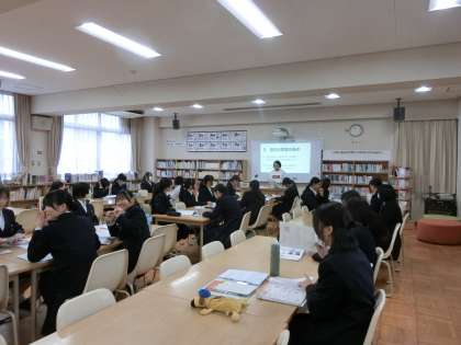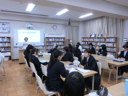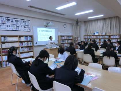 3年生女子の皆さんが保健の授業を受けています。今日の学習内容は「室内の空気環境」について。適度な換気を行わないと二酸化炭素等の増加により、頭痛や集中力低下などの症状が起こりやすくなるそうです。これから寒くなる季節、1時間に5〜10分程度の換気を心がけましょう。